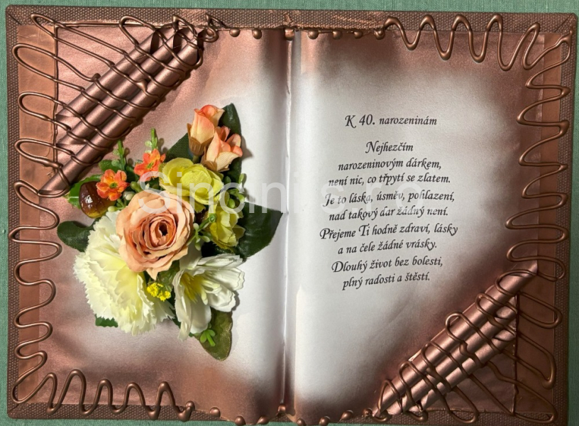 Kniha balená v průsvitném celofánu, na stojánku, převázanou mašličkou postavená na měděném stojánku.