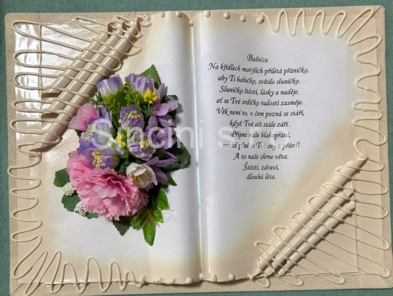 Kniha balená v průsvitném celofánu, na stojánku, převázanou mašličkou postavená na měděném stojánku.