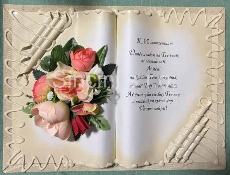 Kniha balená v průsvitném celofánu, na stojánku, převázanou mašličkou postavená na měděném stojánku.