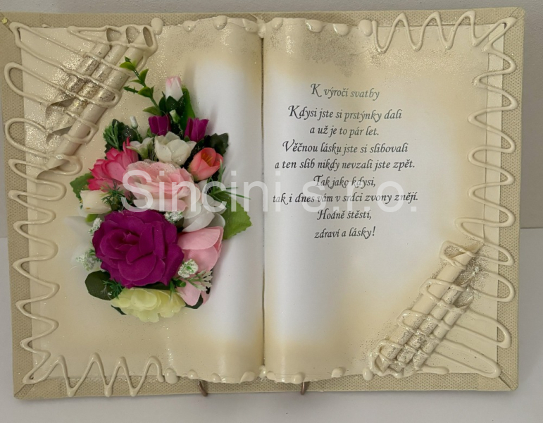 Kniha balená v průsvitném celofánu, na stojánku, převázanou mašličkou postavená na měděném stojánku.