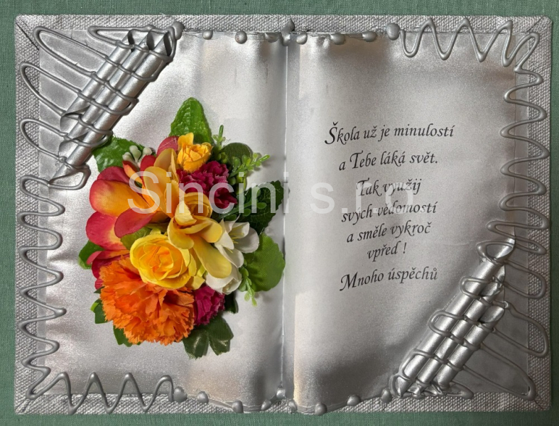 Kniha balená v průsvitném celofánu, na stojánku, převázanou mašličkou postavená na měděném stojánku.