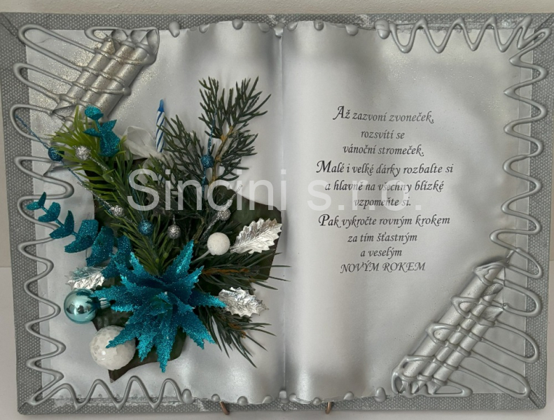Kniha balená v průsvitném celofánu, na stojánku, převázanou mašličkou postavená na měděném stojánku.