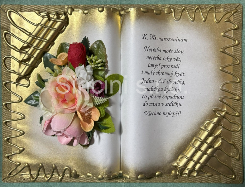 Kniha balená v průsvitném celofánu, na stojánku, převázanou mašličkou postavená na měděném stojánku.
