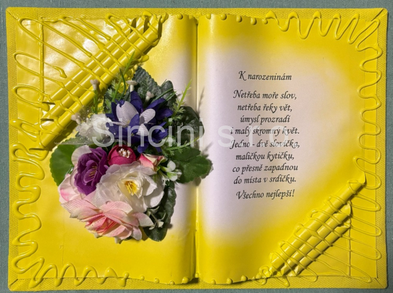 Kniha balená v průsvitném celofánu, na stojánku, převázanou mašličkou postavená na měděném stojánku.